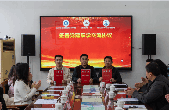 揭牌仪式后,yl6809永利官网集团思政第二党支部、东营胜利一中第四党支部、中国石油大学(华东)附属中学党支部共同签订了党建联学交流协议。三方约定将建立常态化联学机制,共享优质党建资源,联合开展主题党日活动,切实将党的组织优势转化为推动思政课改革发展的强大动力,以高质量党建引领一体化建设走深走实。